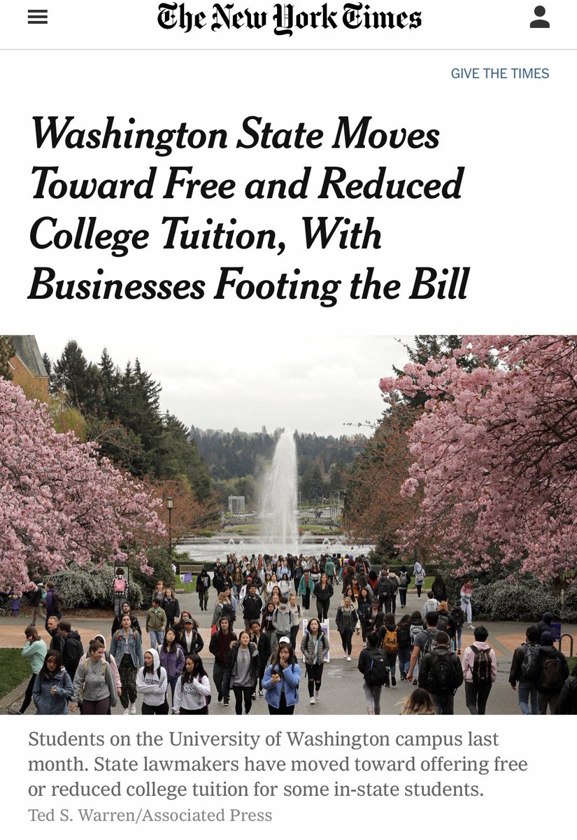 方舟子?Verified account @fangshimin May 9More华盛顿州通过法律,从2020年起,来自低收入家庭(年收入不到州中位数55%,四口之家年收入五万美元)的学生上公立大学免收学费,收入不到州中位数(四口之家年收入9万美元)的补贴学费。经费四年10亿美元,向需要用到受过高等教育员工的公司征收。https://pbs.twimg.com/media/D6G7wMsUwAETQwk.jpg
