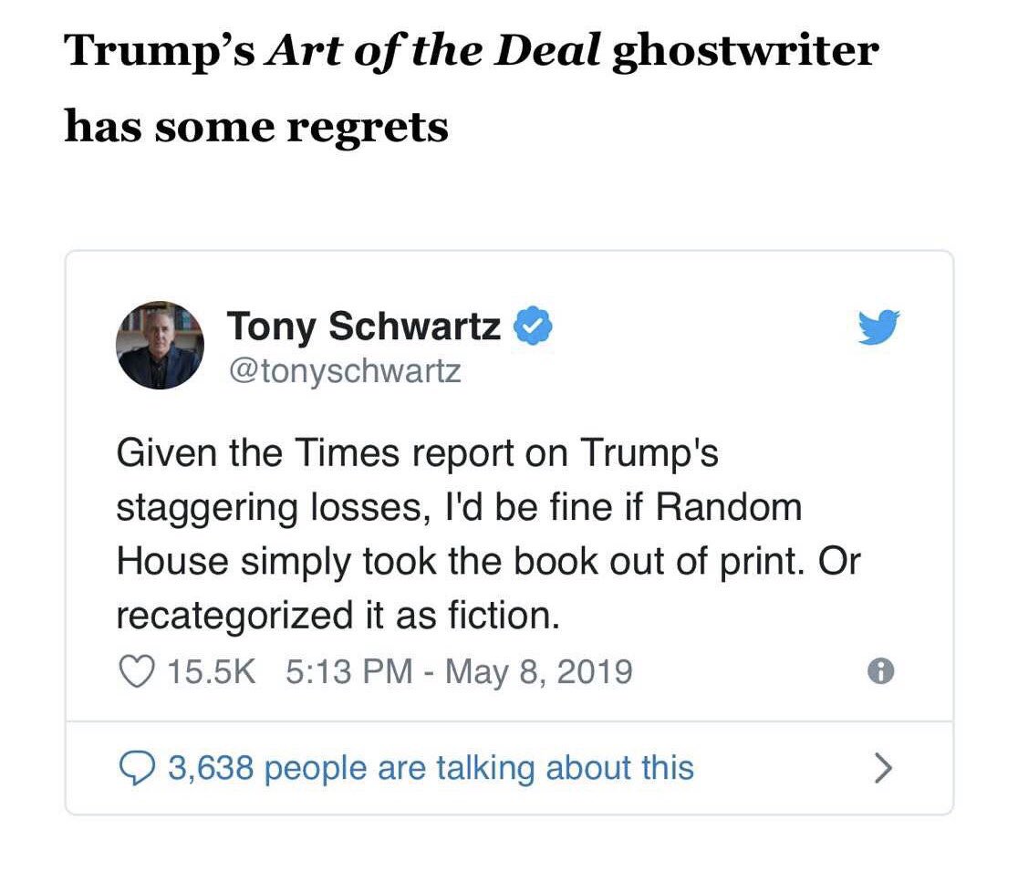 方舟子?Verified account @fangshimin May 9More《交易的艺术》一书的枪手、共同作者说,既然川普十年亏损12亿美元,希望出版社不要再印这本书,或者把它归为小说。也可以改叫《亏损的艺术》嘛。https://pbs.twimg.com/media/D6LI6t1UwAEpSq4.jpg