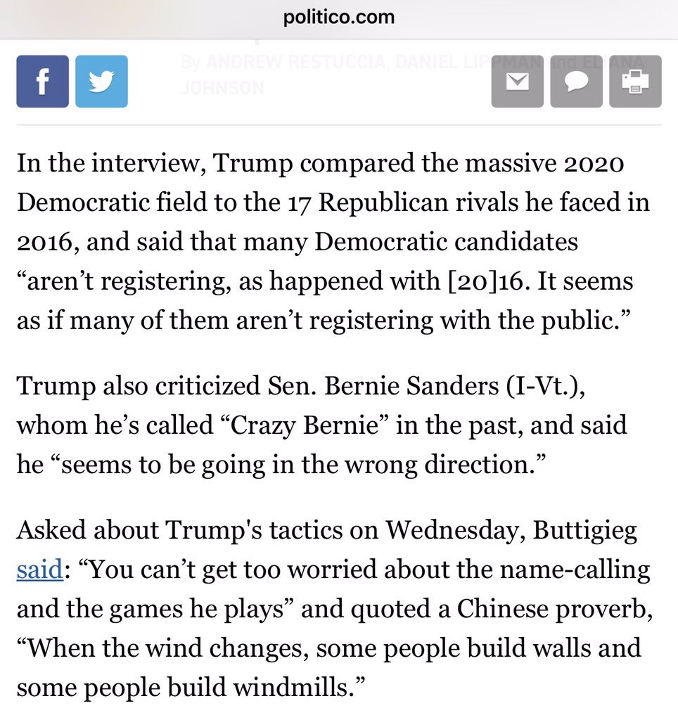 方舟子?Verified account @fangshimin May 12More民主党总统竞选人布提及格在接受采访时引用一句中国谚语:“风云变幻的时候,有人建墙,有人造风车。”我怎么从没听说过有这么句中国谚语,难怪有人说我语文没学好。https://pbs.twimg.com/media/D6bJS9IUUAAfnAp.jpg