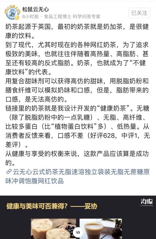 方舟子?Verified account @fangshimin May 15More“食品泡泡博士”云无心卖起了“健康奶茶”,还自称“云式奶茶”,真以为自己是个健康品牌了。这是跟崔正教授学的?应该叫“云无心真茶”嘛。他那个“复合甜味剂”是什么成分?各种代糖?实际上,正如我以前文章里说过的,代糖现在也被发现会带来健康问题。要健康就要低糖、无糖,而不是想用代糖取巧还妄称健康。https://pbs.twimg.com/media/D6p_oUZVUAES3Ty.jpg
