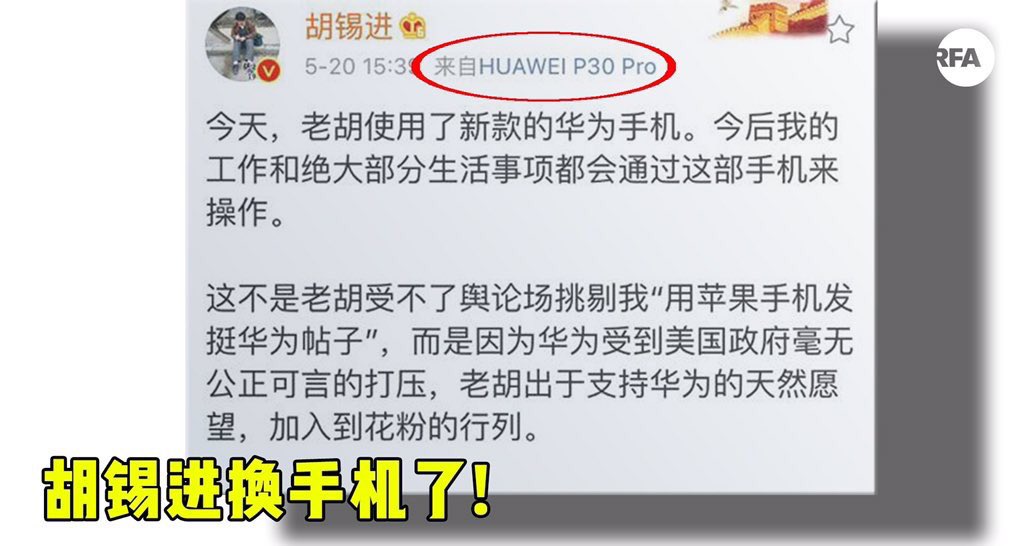 方舟子?Verified account @fangshimin May 21More美国政府对华为的打击很早就开始了,胡锡进怎么到现在才换手机?任正非说,他们全家都用苹果,不要煽动民族情绪。https://pbs.twimg.com/media/D7I250OUcAAhqzB.jpg