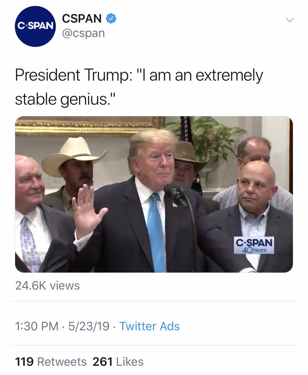 方舟子?Verified account @fangshimin May 23More以前川普说自己是“稳定的天才”还是谦虚了,今天他宣布“我是一个极其稳定的天才”。https://pbs.twimg.com/media/D7TdzL1U0AESbYo.jpg