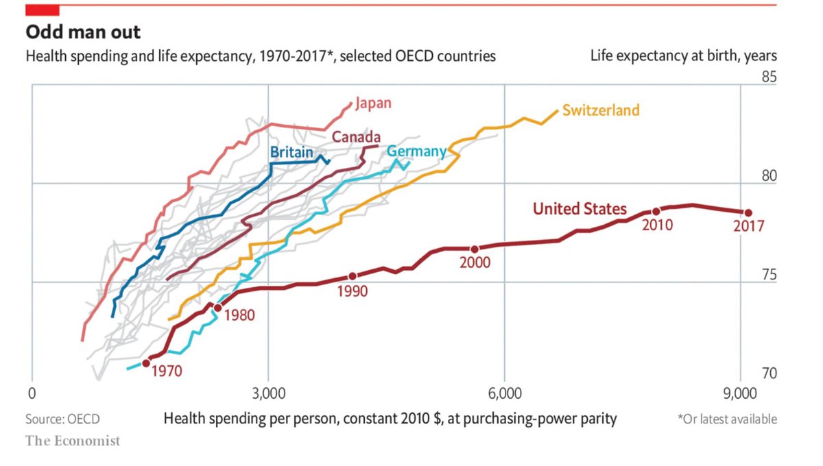 方舟子?Verified account @fangshimin May 26More1970年以来,美国平均一个人的医疗花费增加了5倍,平均预期寿命和其他发达国家的差距却越来越大。https://pbs.twimg.com/media/D7ja9mKUcAIMuUd.jpg