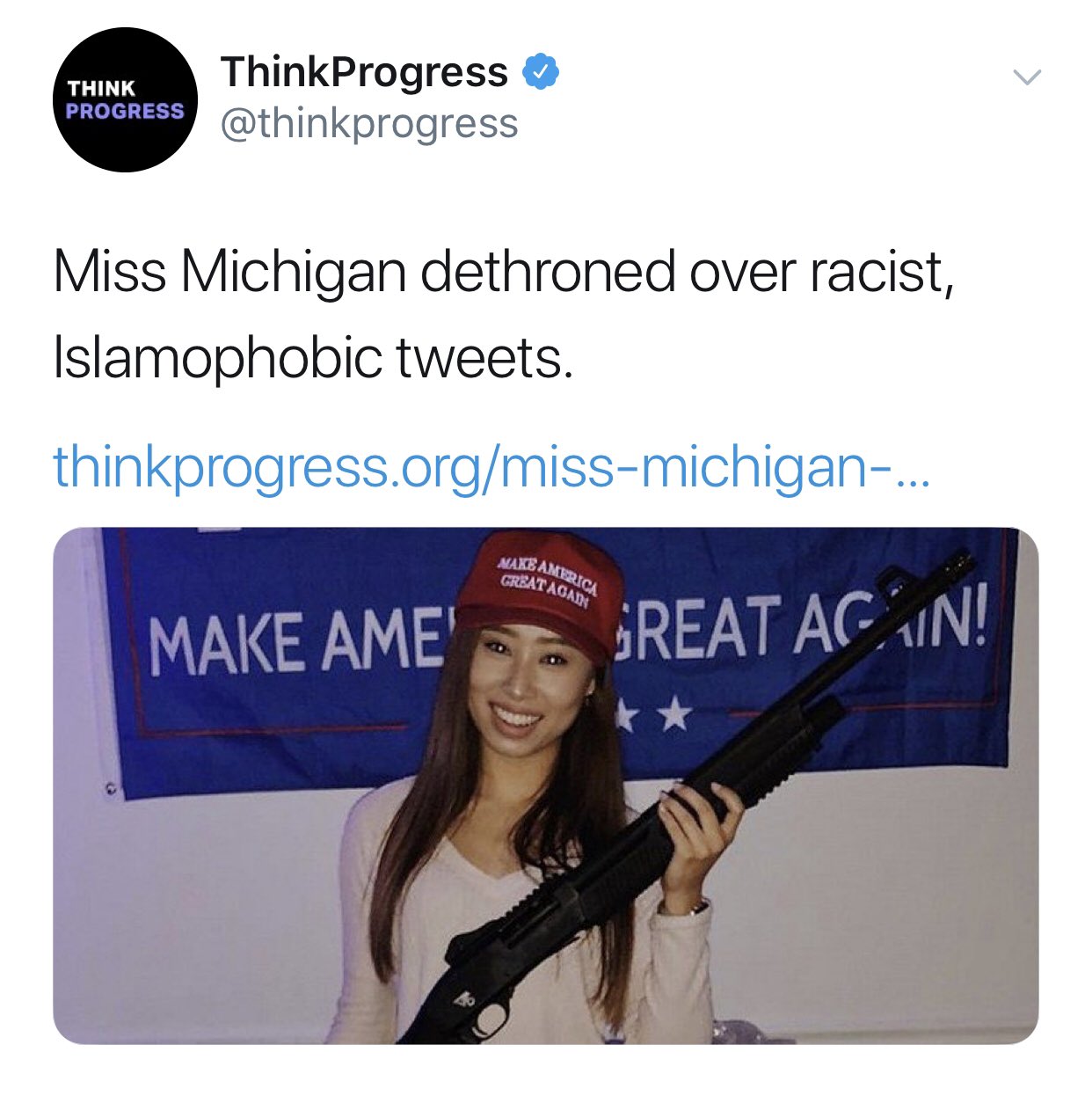方舟子@fangshimin·Jul 20这个人当初是怎么当上密歇根小姐的?评委被她的枪吓着了?https://pbs.twimg.com/media/D_-MqHIUEAA0HjS?format=jpg&name=large