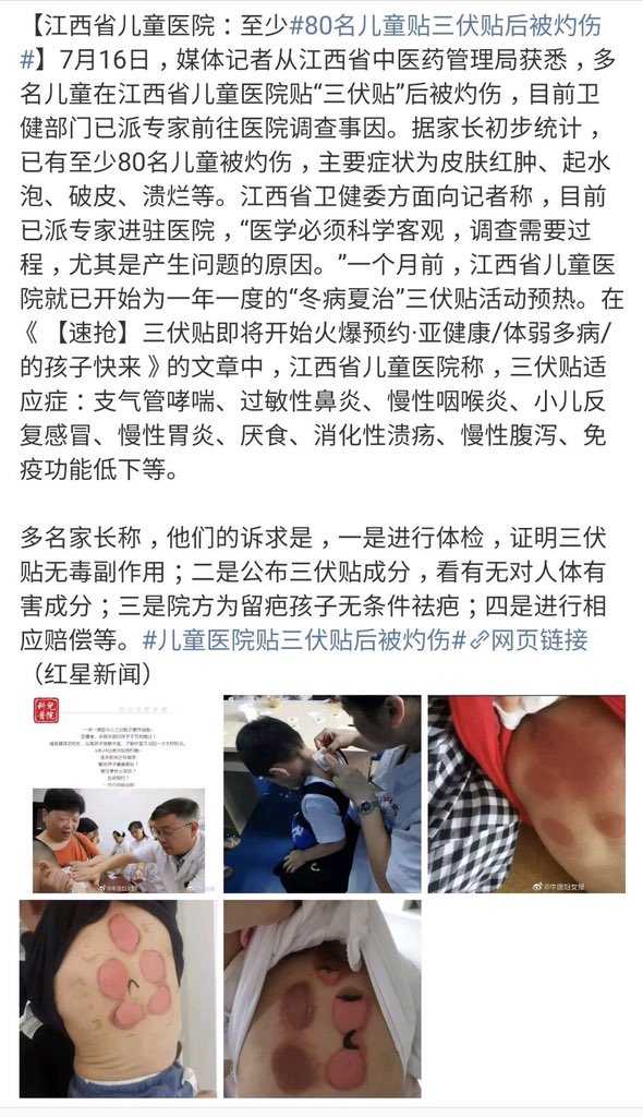 方舟子@fangshimin·Jul 19这些家长在不知道三伏贴成分和毒副作用的情况下就敢把小孩送去医院受三伏贴毒害,出问题了再来要求院方公布三伏贴成分和证明无毒副作用,这些家长是不是也该被追究虐待儿童的责任?https://pbs.twimg.com/media/D_2WbSnUYAADoN1?format=jpg&name=medium