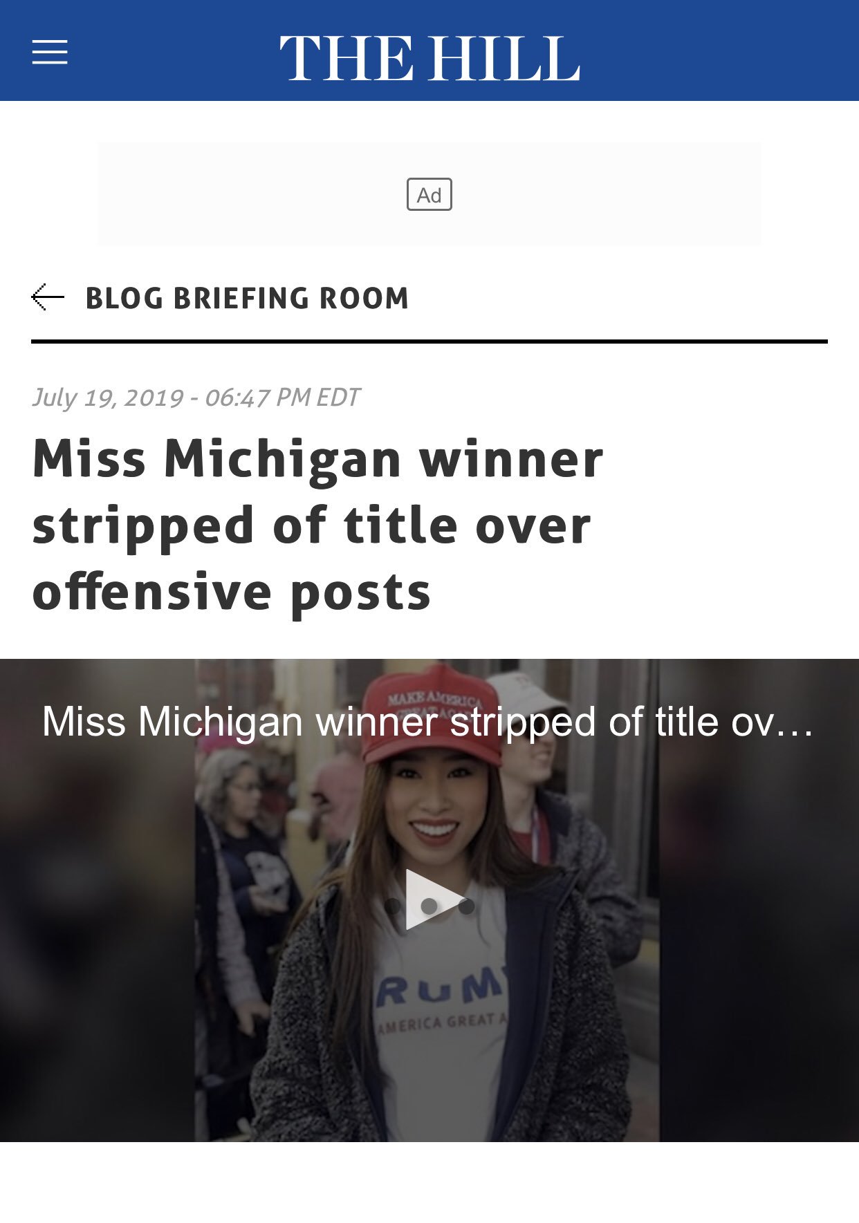 方舟子@fangshimin·Jul 20今年获得密歇根小姐的密西根大学朱姓华裔女生作为川普支持者,在推特上发表歧视穆斯林和黑人的言论,被剥夺密歇根小姐头衔,失去竞争美国小姐的资格。用川普支持者新的竞选口号来说,是不是还应该“送她回去”(Send her back)。https://pbs.twimg.com/media/D_51tIWUEAAYkpE?format=jpg&name=large