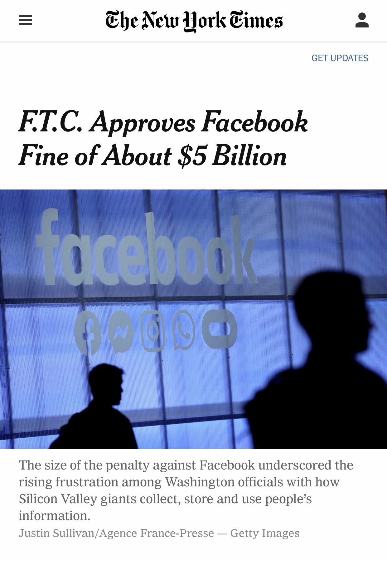 方舟子@fangshimin·Jul 12美国联邦贸易委员会表决同意脸谱交50亿美元罚款,以结束其其侵犯用户隐私一案。3名共和党委员赞成,2名民主党委员反对,反对的原因是认为处罚不够严厉。https://pbs.twimg.com/media/D_Utk15VUAEw9w8?format=jpg&name=large
