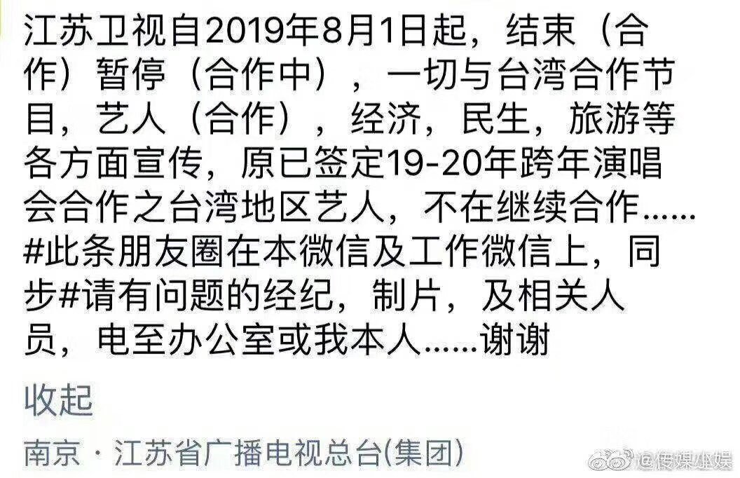 方舟子@fangshimin·Jul 31江苏卫视说是假消息,台湾艺人只要表态支持统一还可以放心在大陆赚钱。https://pbs.twimg.com/media/EA2RtSqUYAAIni7?format=jpg&name=medium