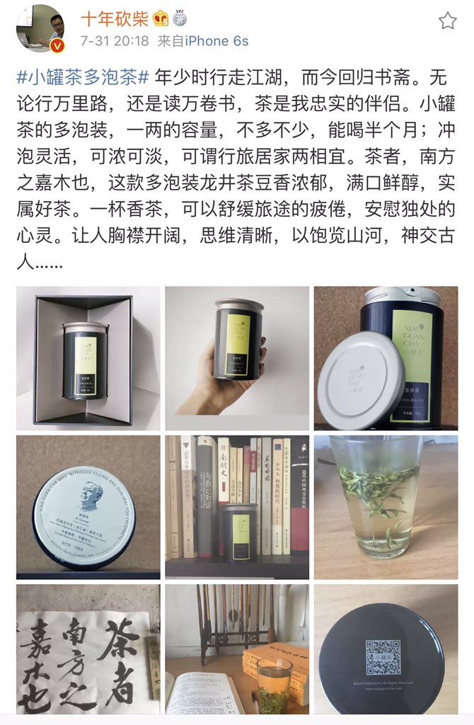 方舟子@fangshimin·Jul 31连十年砍柴都推销起了小罐茶,看来网红、半网红的最后归宿都是卖货。不过小罐茶既骗人又不环保。https://pbs.twimg.com/media/EA3I2GMVUAUFgOF?format=jpg&name=medium