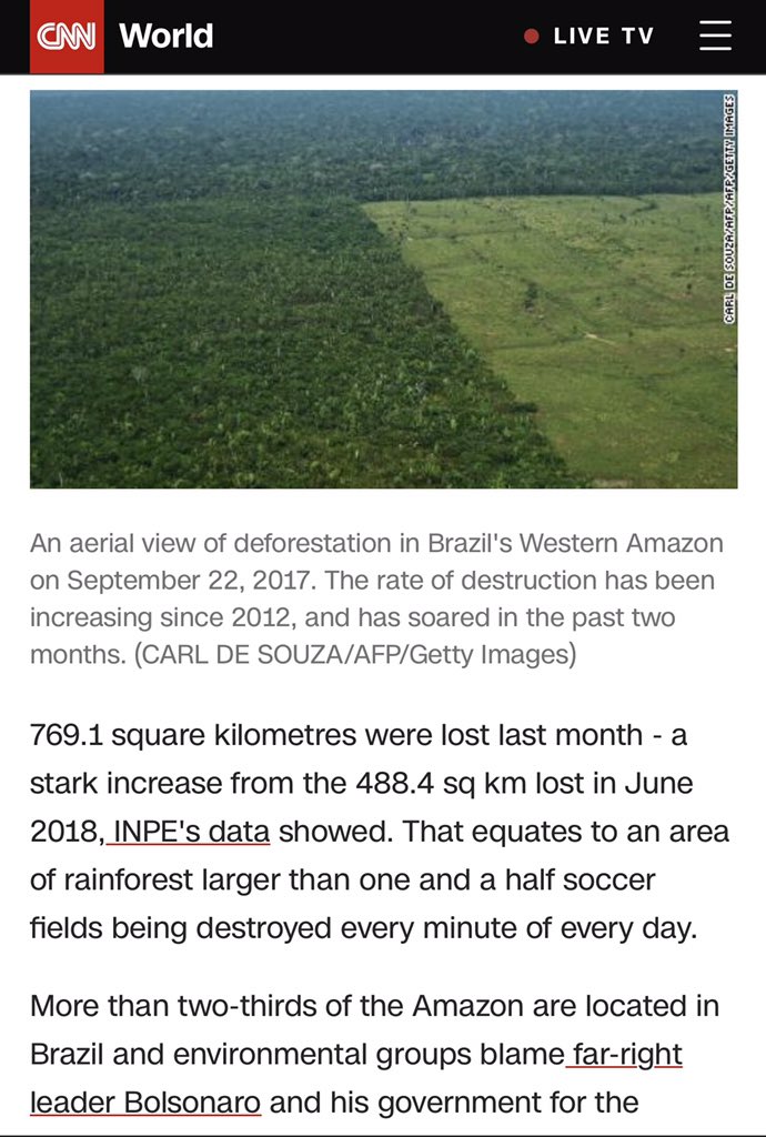 方舟子@fangshimin·Jul 26“巴西的川普”上台以来,加速砍伐亚马逊热带雨林,每分钟砍掉相当于一个半足球场大小的亚马逊热带雨林。这么砍下去,世界要完。https://pbs.twimg.com/media/EAcr-J0VAAc_5pS?format=jpg&name=medium