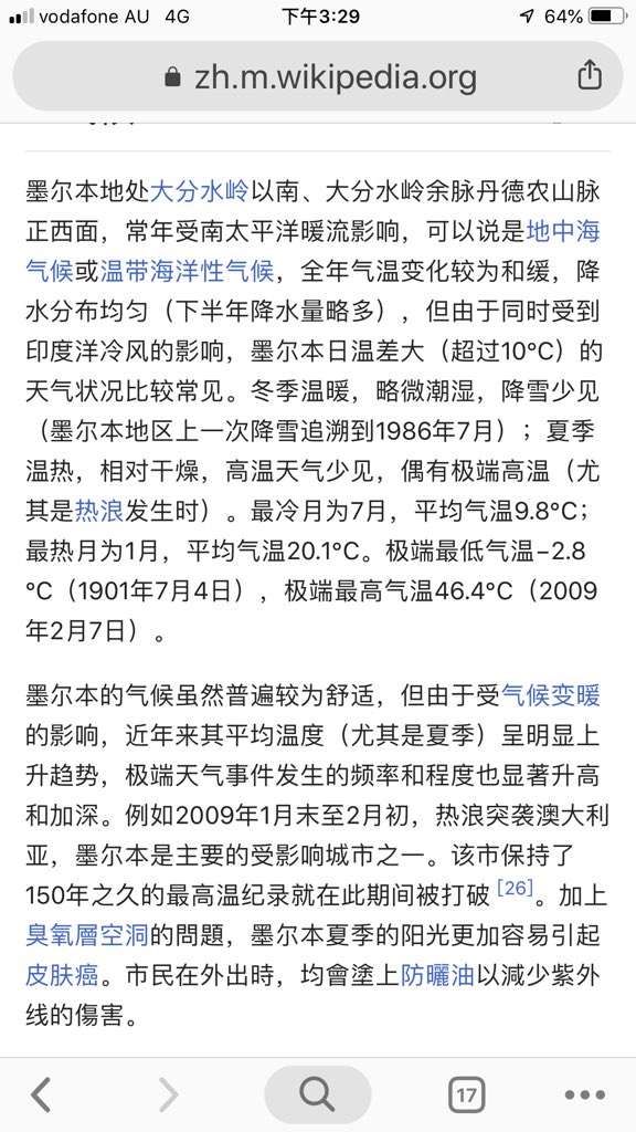方舟子@fangshiminReplying to @River0074在墨尔本20年,查维基还不会查英文的,居然把错误连篇的中文维基当回事,你是来搞笑的?Melbourne has a temperate oceanic climate (K?ppen climate classification Cfb) with warm to hot summers and cool winters.