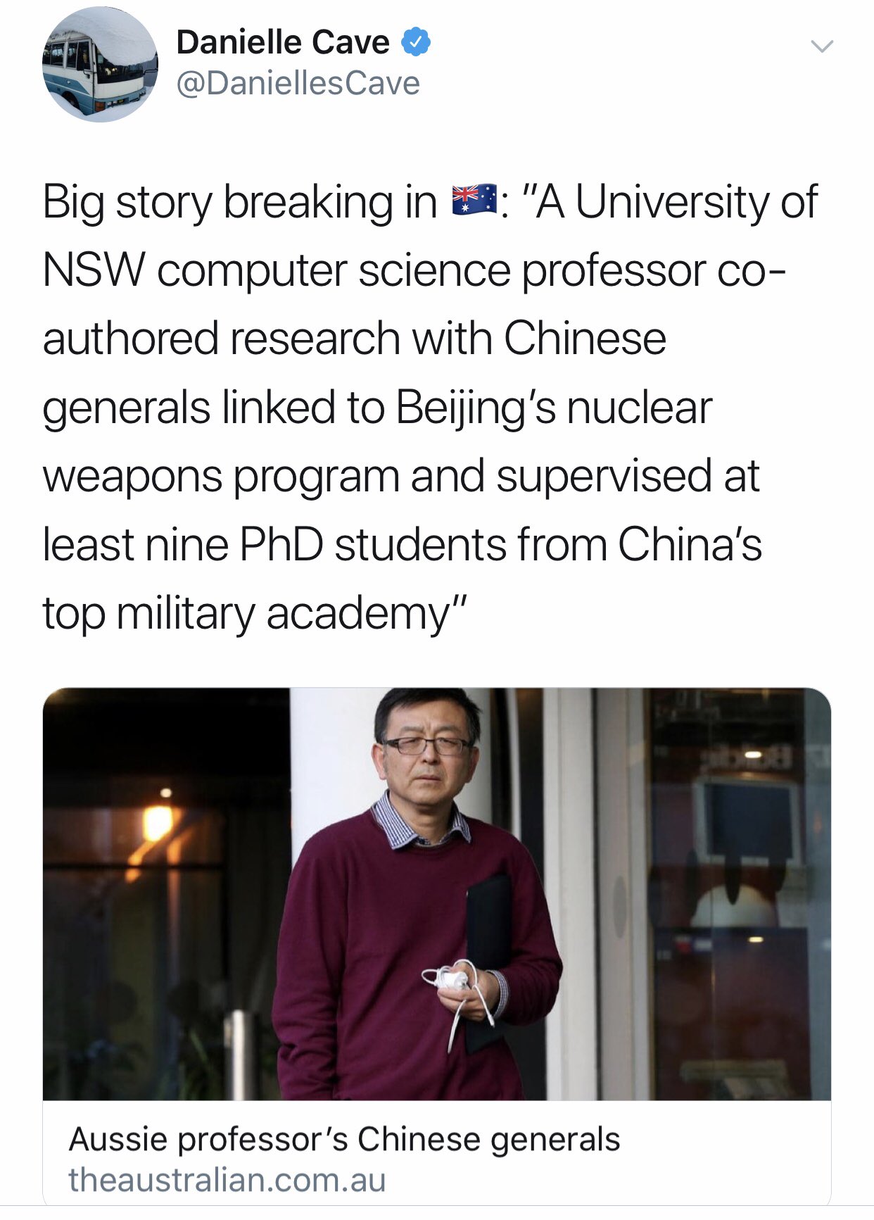 方舟子@fangshimin·Jul 31又有人要被迫毅然回国了?澳大利亚媒体称,新南威尔士大学计算机系教授薛Jingjing与国防科大校长合作研究,还招了至少9名国防科大的人当博士生,研究和核武器研制有关的超级计算。我查了一下,两年前澳大利亚就有媒体报道此事,好像对薛教授也没影响。https://pbs.twimg.com/media/EAyUSM2UYAEGdwJ?format=jpg&name=large