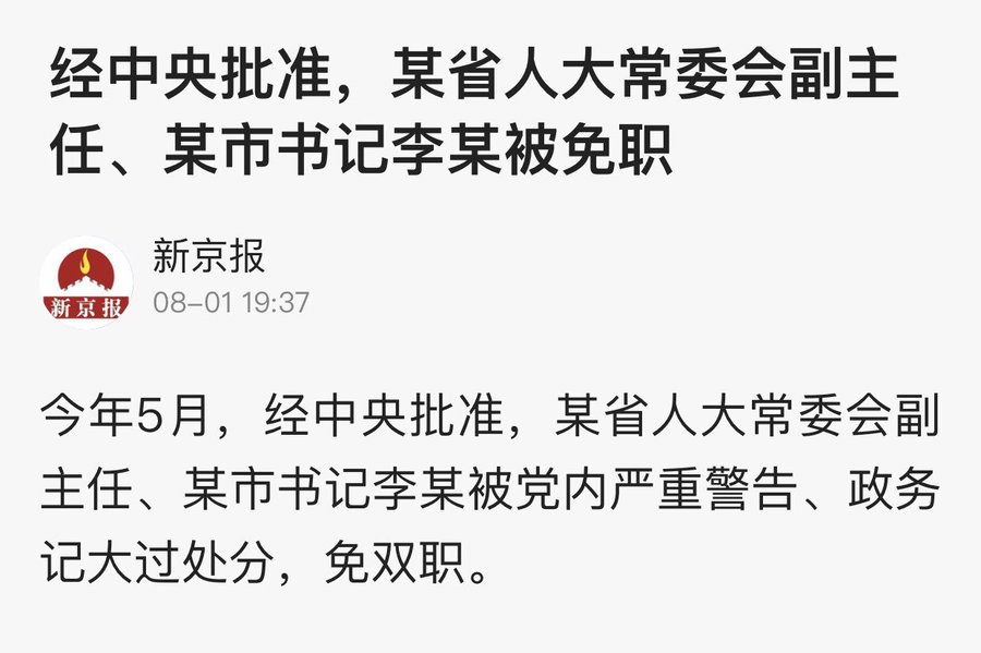 方舟子@fangshimin·Aug 2某国某报如此报道新闻,“某省人大常委会副主任、某市书记李某被党内严重警告、政务记大过处分,免双职。”世界新闻史上的奇迹。https://pbs.twimg.com/media/EBAlghFUcAE4ryT?format=jpg&name=900x900