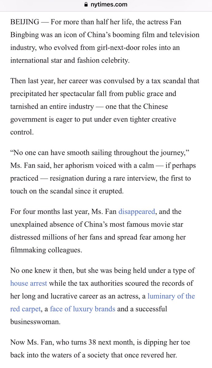 方舟子@fangshimin·Aug 2《纽约时报》报道,范冰冰接受采访时称,去年她被软禁了4个月。https://pbs.twimg.com/media/EBBU8wCUcAAnx0w?format=jpg&name=medium