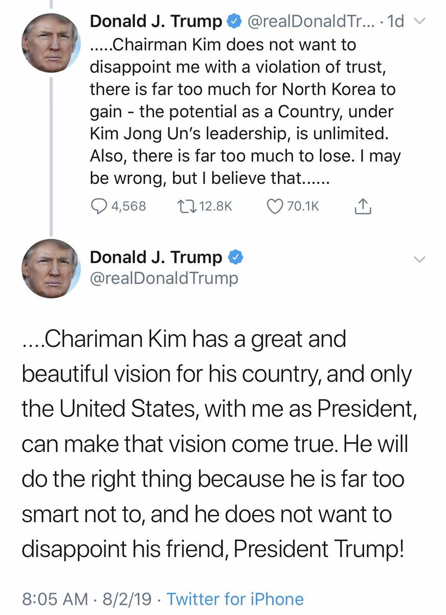 方舟子@fangshimin·Aug 3川总统又在向金主席表衷心:“金主席对他的国家有伟大、美丽的愿景,只有在我领导下的美国能帮助他实现,他这么聪明,不会让他的朋友川普总统失望的。”有自称“刘强东先生”的,就有自称“川普总统”的。https://pbs.twimg.com/media/EBF1s-2U4AAf5sY?format=jpg&name=medium