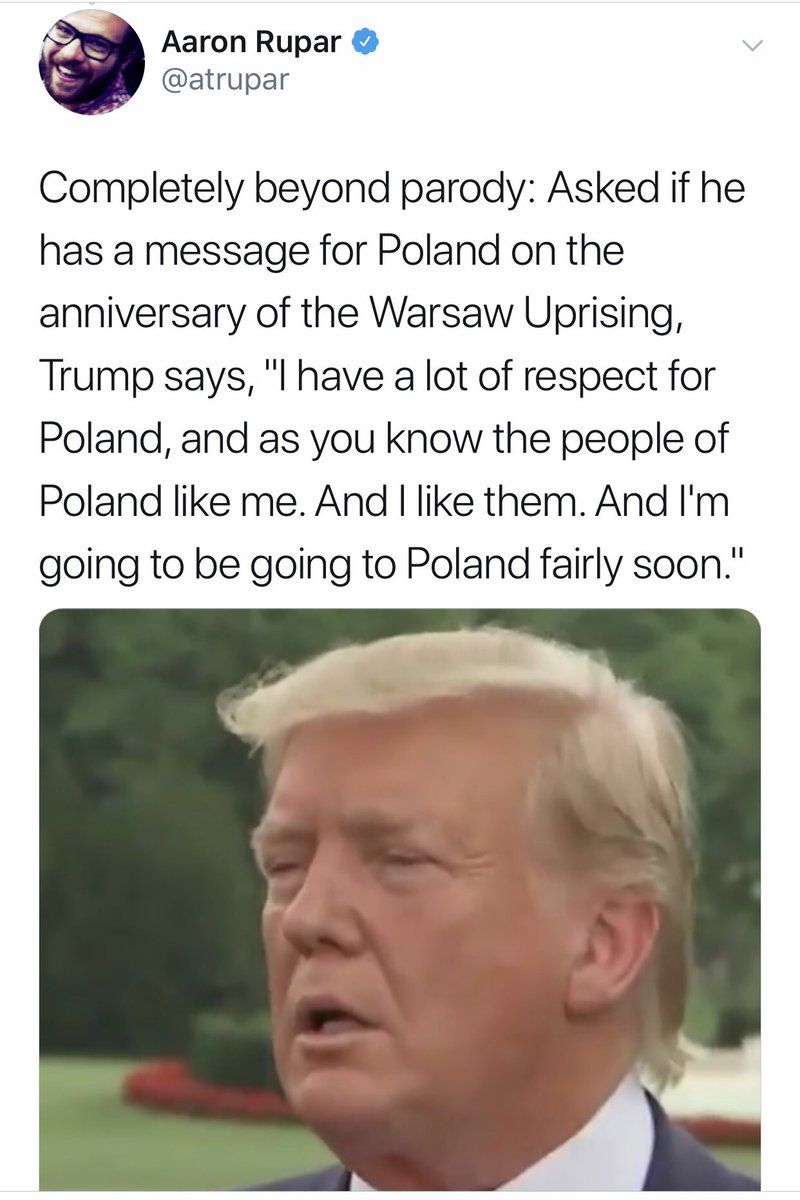 方舟子@fangshimin·Aug 3记者问川普对华沙起义周年纪念的看法,川普说:“波兰人民喜欢我。”极端稳定的天才虽然不知道华沙起义,至少知道华沙在波兰,有小学三年级水平,不错了。https://pbs.twimg.com/media/EBGJfkaU0AECZ5f?format=jpg&name=medium