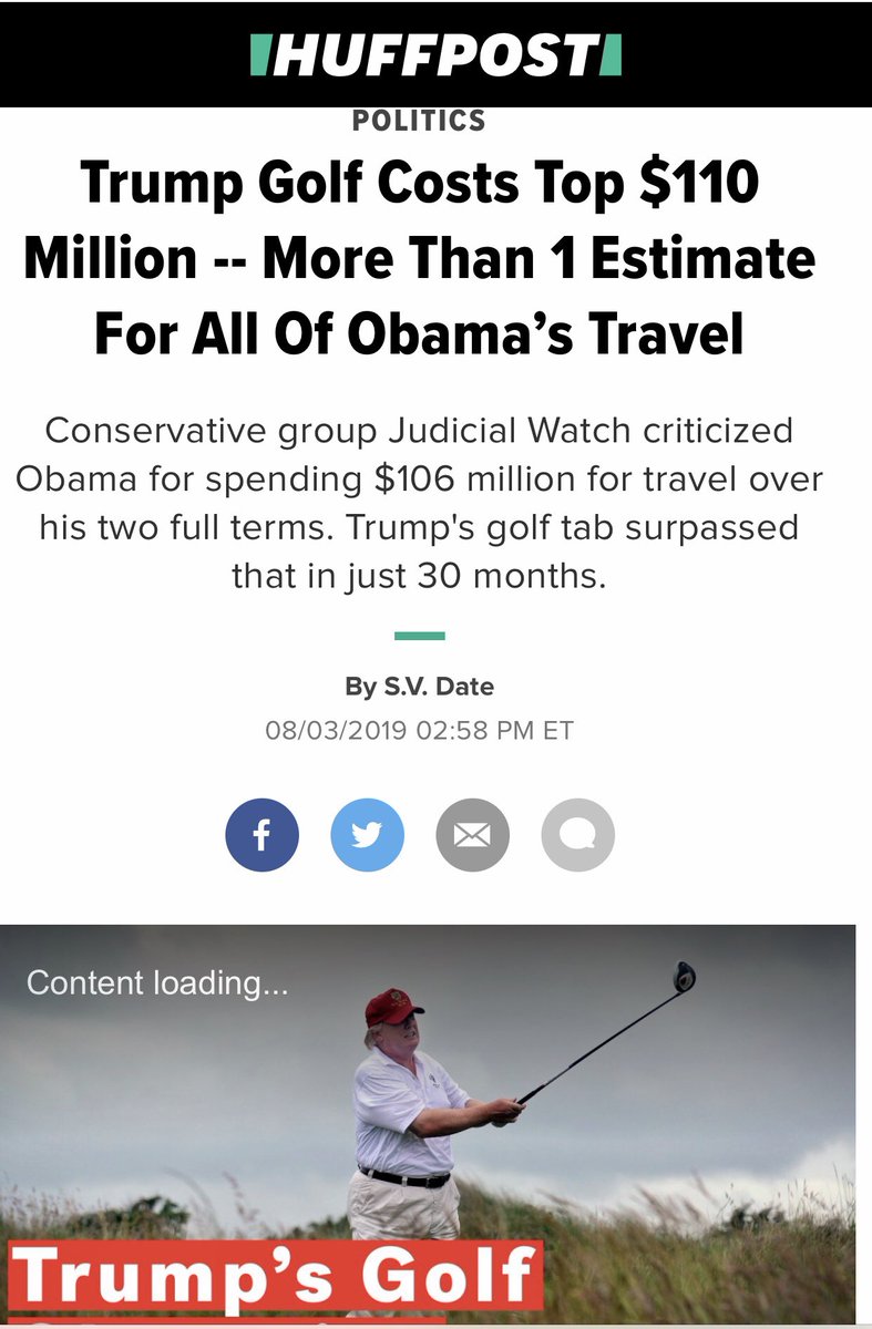 方舟子@fangshimin·Aug 5这个周末美国连续发生大型枪击案,不影响川普去打高尔夫球。川普上任二年半,纳税人已为他打高尔夫球付了1亿1千万美元,超过奥巴马执政八年的全部旅行(不只是去打高尔夫)的费用。我记得川普以前还批过奥巴马高尔夫球打得太多。https://pbs.twimg.com/media/EBMCH1uU4AEq4Y-?format=jpg&name=medium