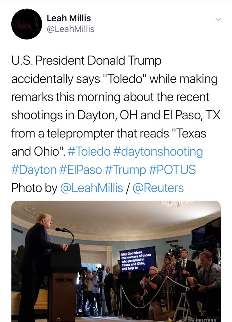 方舟子@fangshimin·Aug 5今天川普终于出来谴责枪击案,艰难地念着稿,最后冒出一句“上帝保佑托莱多的遇难者”。这个要怪提词板里只显示“上帝保佑俄亥俄州的遇难者”,于是极端稳定的天才就分不清代顿和托莱多了。天才说枪不是问题,人才是问题,要怪美国精神病太多。美国每年死于枪击人数是英国几百倍,美国精神病也是几百倍?https://pbs.twimg.com/media/EBPqGpiU0AAZZ8B?format=jpg&name=medium