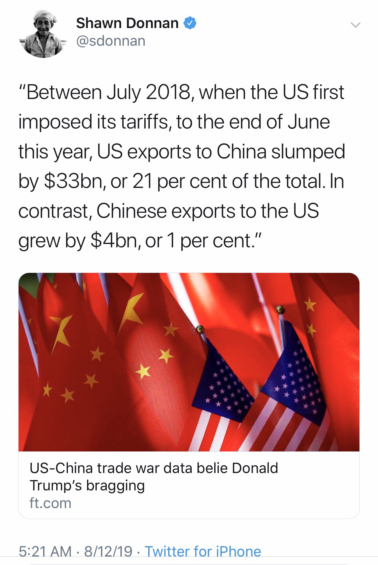 方舟子@fangshimin·Aug 12自去年7月爆发中美贸易战以来,美国出口中国总值减少21%,中国出口美国总值反而增加1%。怎么回事,川总统不是一直宣布贸易战取得伟大胜利了嘛。https://pbs.twimg.com/media/EB1IuYnUEAAROoT?format=jpg&name=large