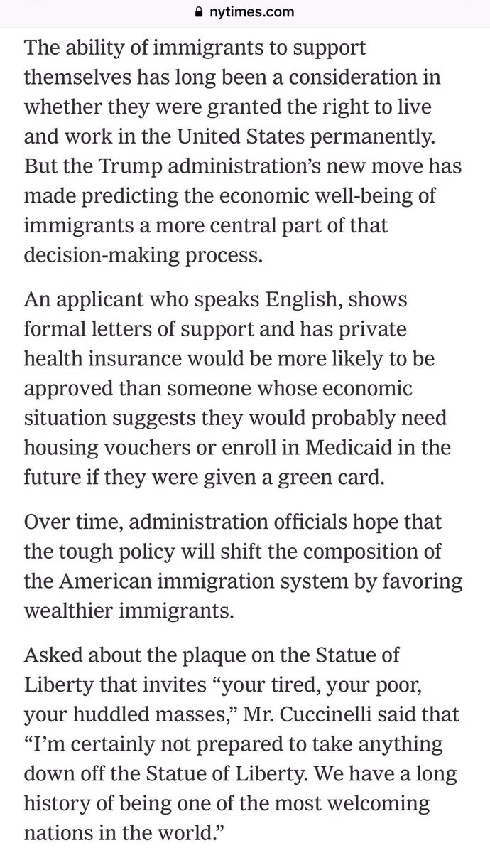 方舟子@fangshimin·Aug 12还没对付完非法移民,就开始对付合法移民:川普当局宣布接受过政府福利的合法移民将不能获得绿卡,只欢迎富人移民。以后还会对付永久居民、归化公民的。但愿华人川粉或其亲属无病无灾、一直有好工作,从没用过政府福利。移民局局长说现在还没打算铲掉自由女神像铭文。我觉得还是早日铲掉的好,免得讽刺https://pbs.twimg.com/media/EBz0ZgwUwAAdaHu?format=jpg&name=largehttps://pbs.twimg.com/media/EBz0ZgxU0AA3e8e?format=jpg&name=4096x4096https://pbs.twimg.com/media/EBz0ZgxVAAEwprd?format=jpg&name=medium