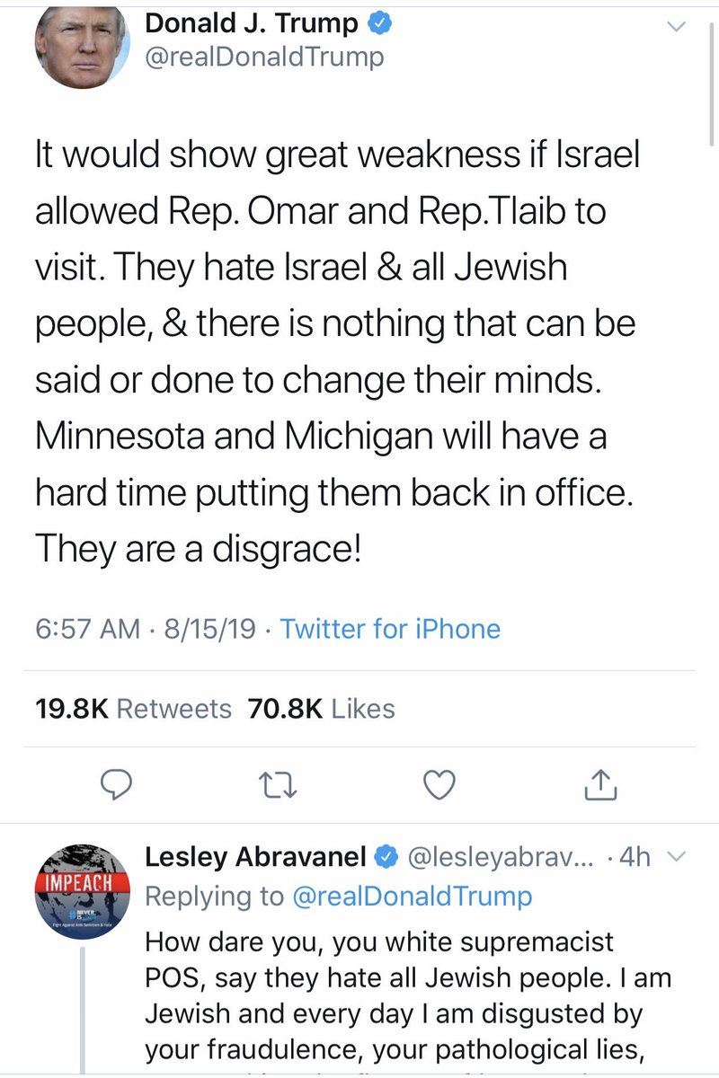 方舟子@fangshimin·Aug 15美国两名穆斯林女议员(包括一名巴勒斯坦裔)原本计划访问约旦河西岸,川普要求以色列不要让她们入境,否则显得软弱。以色列马上宣布禁止她们入境。这是美国史上总统首次要求外国政府禁止政敌入境,接下去就该是禁止政敌出境了。不让批评者入境恰恰显得软弱,也说明在极右治下以色列并非自由式民主国家https://pbs.twimg.com/media/ECDJaYFUwAAAz56?format=jpg&name=medium