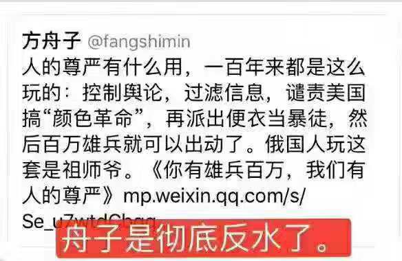 方舟子@fangshimin·Aug 13人的尊严有什么用,一百年来都是这么玩的:控制舆论,过滤信息,谴责美国搞“颜色革命”,再派出便衣当暴徒,然后百万雄兵就可以出动了。俄国人玩这套是祖师爷。《你有雄兵百万,我们有人的尊严》https://mp.weixin.qq.com/s/Se_u7wtdCbqqB6aQdzMy8Q