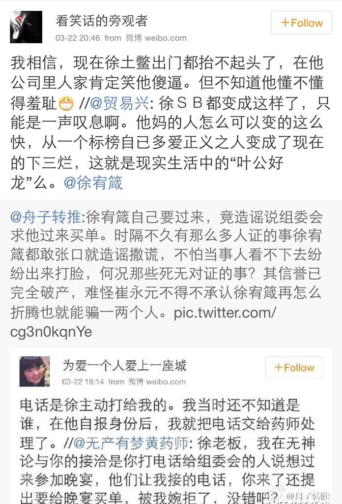 方舟子 @fangshimin · Mar 22徐宥箴自己要过来,竟造谣说组委会求他过来买单。时隔不久有那么多人证的事徐宥箴都敢张口就造谣撒谎,不怕当事人看不下去纷纷出来打脸,何况那些死无对证的事?其信誉已完全破产,难怪崔永元不得不承认徐宥箴再怎么折腾也就能骗一两个人。 https://pbs.twimg.com/media/CAwEEnlUMAEH939.jpg:large