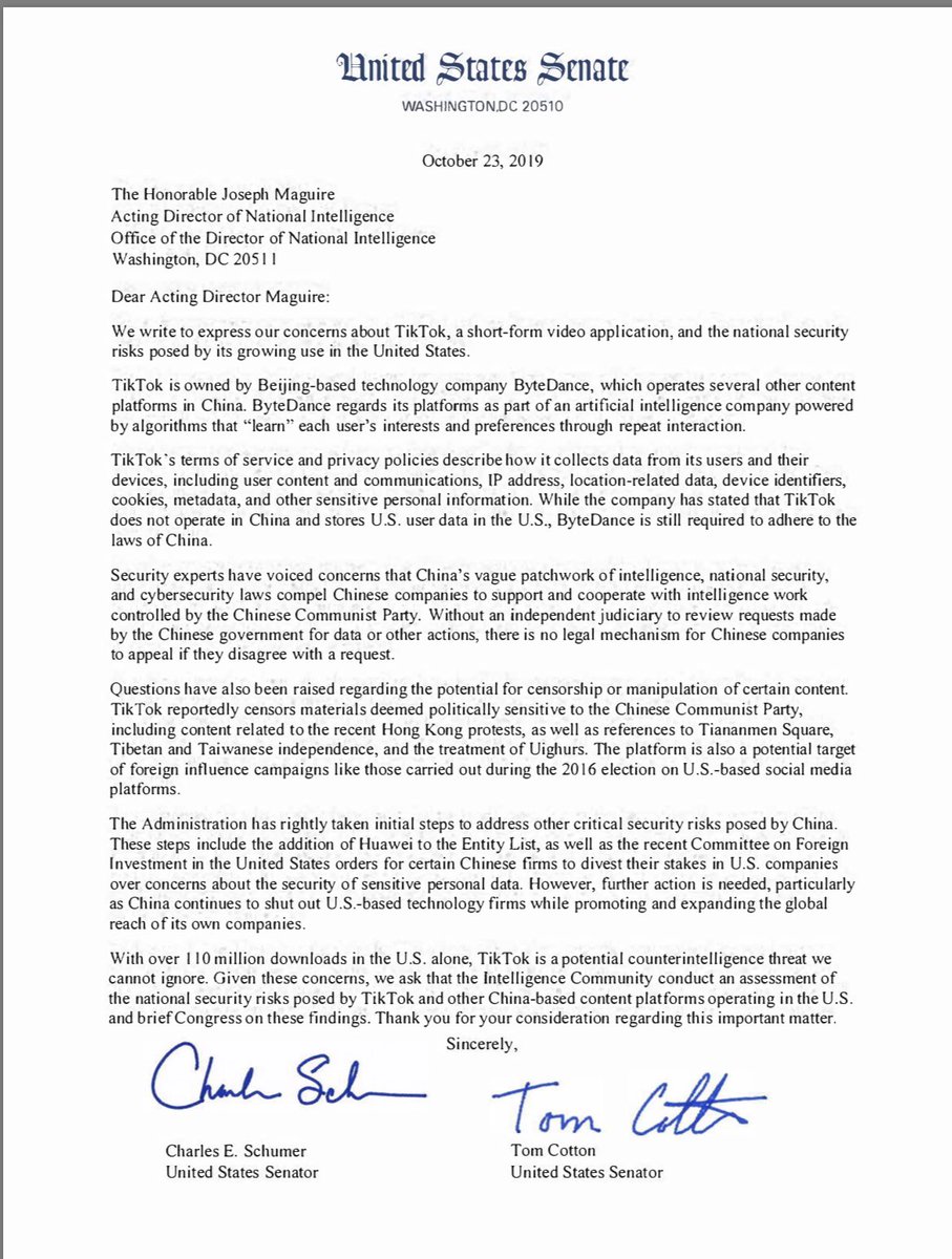 方舟子@fangshimin·Oct 24美国参议院少数党领袖和一名共和党参议员联名致信国家情报局代局长,要求调查抖音美国版是否危害美国国家安全,声称其采集用户数据,隶属中国公司,需要听命于中国政府。抖音美国公司对此声明他们不会听命于中国政府,你信不信?墙内怎么反制?也找一家美国视频平台调查?等等,它们早都不许进入墙内。https://pbs.twimg.com/media/EHs1r_jU0AE4SJe?format=jpg&name=medium