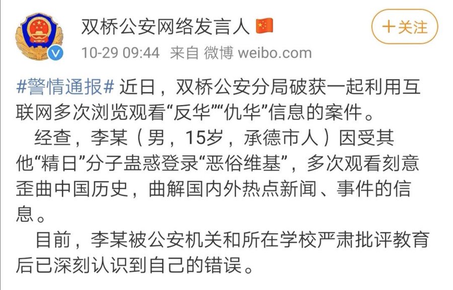 方舟子@fangshimin·Oct 2915岁未成年人上网浏览观看“反华”“仇华”信息被抓。不仅不能写,看也不行,古今中外也无此暴政。https://pbs.twimg.com/media/EIB3_R-VUAAh0P5?format=jpg&name=900x900