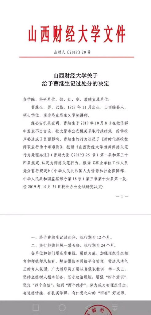 方舟子@fangshimin·Oct 28山西财经大学这名教师究竟在微信群发表了什么不当言论,被公安机关行政拘留后,学校还要给处分。根据内蒙村民的事推测,是不是抱怨学校食堂饭量不足啊?https://pbs.twimg.com/media/EIBabD6U0AIUIEJ?format=jpg&name=medium