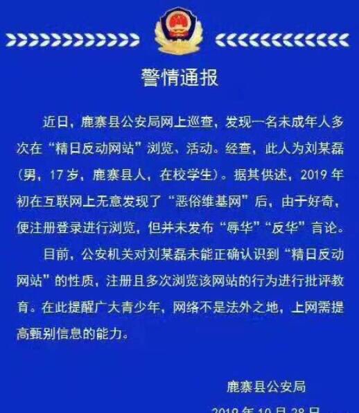 方舟子@fangshimin·Oct 29又有一名未成年人因为浏览“恶俗维基网”被抓去教育。为什么这段时间全国各地警察都在给这个网站打广告,因为浏览该网站或在该网站发言被抓的已有十来起,是不是它被某个大领导点名了?https://pbs.twimg.com/media/EIGdspiUUAAleKH?format=jpg&name=small