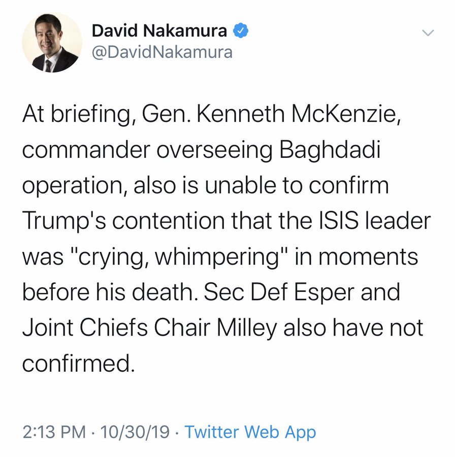 方舟子@fangshimin·Oct 30美军参谋长联席会议主席和美国国防部长都说不知道川普从哪听说的巴格达迪自杀前又哭又闹,又不好直接说川普撒谎,给他留了面子,说也许他是从行动指挥那里听来的。结果行动指挥也说不知道川普哪来的这个细节。这些军人太可恶了,都不配合总司令演戏。https://pbs.twimg.com/media/EIL_NF3WsAE_UGh?format=jpg&name=900x900