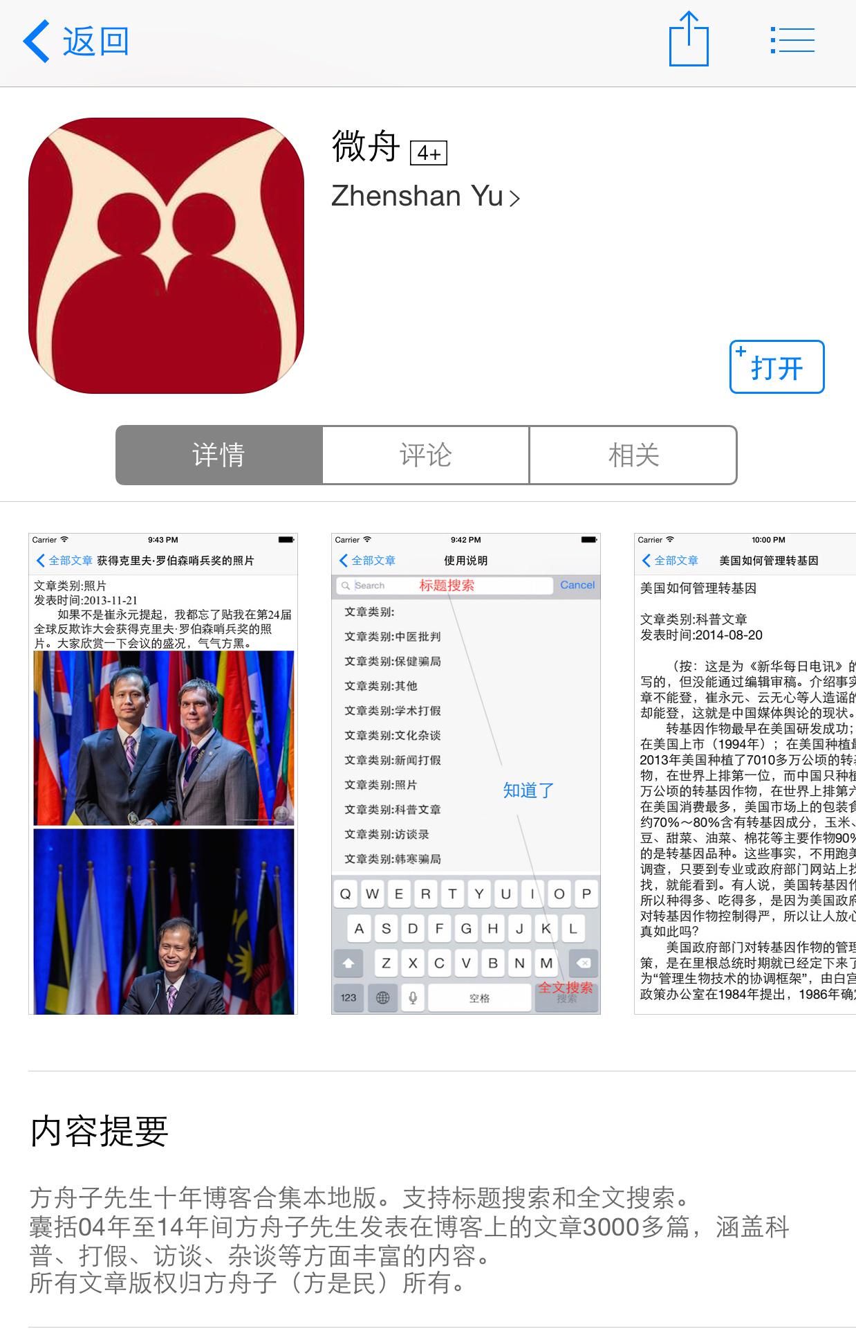 方舟子 @fangshimin · Mar 31有些文章版式乱了,没有分行、分段。“@zhenshan_yu: 微舟已在APP Store上线。微舟是方舟子先生十年博客合集本地版,支持标题搜索和全文搜索。所有文章版权归方舟子所有。如对此APP有意见和建议,请直接联系我。”https://pbs.twimg.com/media/CBbvD4aUcAAUmIC.jpg:large