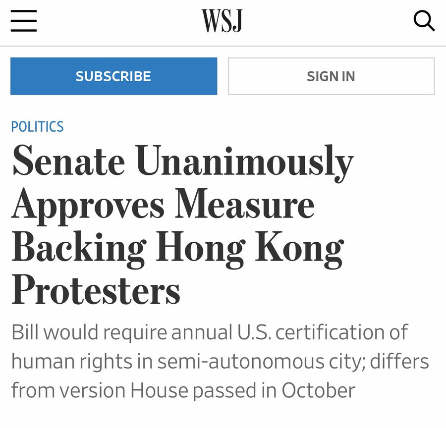 方舟子@fangshimin·Nov 19“西方反华势力”又猖獗了:今天美国参议院全票通过关于香港的两个法案,与上个月众议院全票通过的法案略有不同,没那么严苛,不过都要求美国国务院每年审核一次香港自治状况以决定是否经济制裁。两院要协调形成统一法案,然后就算过了,因为是全票通过,川普即使不愿签署也没意义。https://pbs.twimg.com/media/EJyJhXsUEAEjH3c?format=jpg&name=900x900