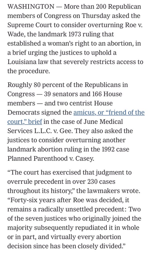 方舟子@fangshimin·Jan 239名共和党参议员和166名共和党众议员(大约占共和党议员的80%)联名要求美国最高法院考虑推翻1973年关于人工流产合法化的判决。没有联名的共和党参议员大多是今年要重选,怕得罪选民。他们也知道这很不得人心。共和党实现让人工流产非法的终极目标又进了一步,川普如果有机会再塞进一名大法官就成。https://pbs.twimg.com/media/ENVfjwcVAAEGk_q?format=jpg&name=medium