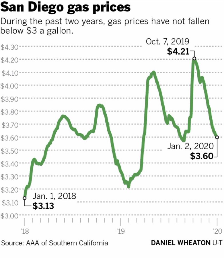 方舟子@fangshimin·Jan 4两年来圣地亚哥汽油油价(每加仑)变化。加州油价是全美国最高的,要比其他州高大约$1。原因很复杂,但不是由于很多人设想的因为加州税高。税只是让油价每加仑多了5.6分。https://pbs.twimg.com/media/ENfskzdU4AEwc-6?format=jpg&name=900x900