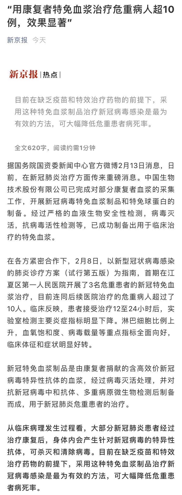 方舟子@fangshimin·Feb 13刚刚康复的患者血液里还有较多抗体,理论上是有可能用于治疗病人的,以前治疗埃博拉、重症流感国外都尝试过,对其有效性有争议。但是没做临床试验,尝试了十例就敢说“效果显著”,就要求康复者献血,那是只有中国医生敢这么说。这种疗法,不仅有效性,而且安全性和可行性都是问题。https://pbs.twimg.com/media/EQtZpXjU4AIO_LC?format=jpg&name=large