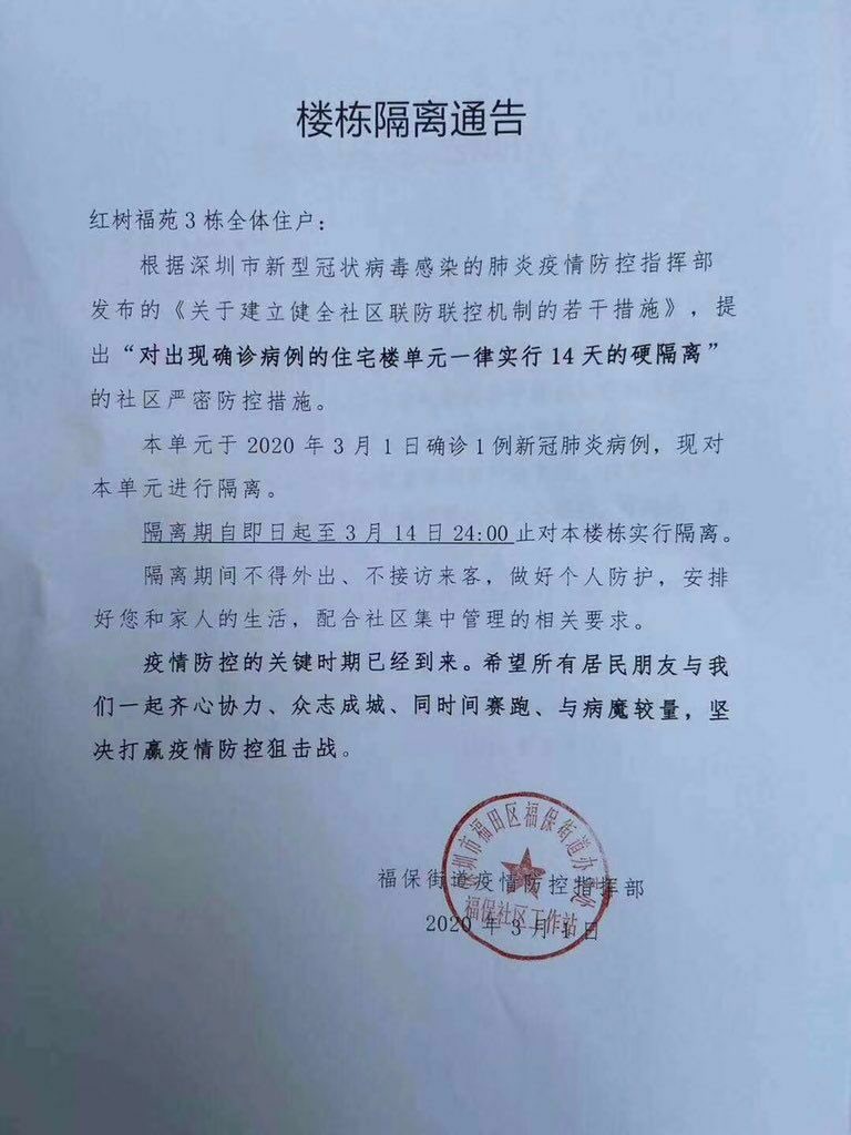 方舟子@fangshimin·Mar 2深圳发现一个病例,隔离了一个住宅楼单元14天,邻居们又都得在家坐牢。https://pbs.twimg.com/media/ESFu_DtUEAIymTC?format=jpg&name=medium
