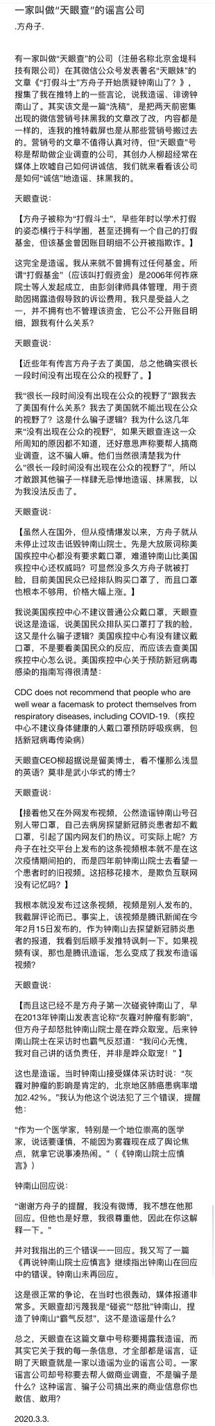 方舟子@fangshimin·Mar 3发一个图像版《一家叫做“天眼查”的谣言公司》。https://pbs.twimg.com/media/ESPty7nVAAAEwqF?format=jpg&name=large