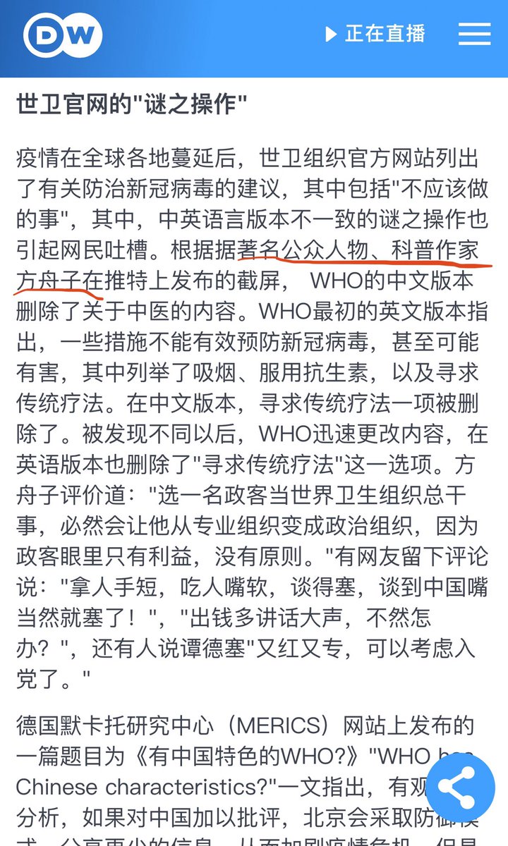方舟子@fangshimin·Mar 7被发现中英版本内容不一致后,世界卫生组织干脆把英文版关于不要喝传统草药预防新冠病毒那一条也删了,与中文版一样了,不过其他语种版本还没删。选一名政客当世界卫生组织总干事,必然会让它从专业组织变成政治组织,因为政客眼里只有利益,没有原则。https://pbs.twimg.com/media/ESjk5vWU8AAXRw7?format=jpg&name=smallhttps://pbs.twimg.com/media/ESjk5vYU8AELXQe?format=jpg&name=smallhttps://pbs.twimg.com/media/ESjk5xmU8AAIcaX?format=jpg&name=smallhttps://pbs.twimg.com/media/ESjk5yQUYAIUe_D?format=jpg&name=small