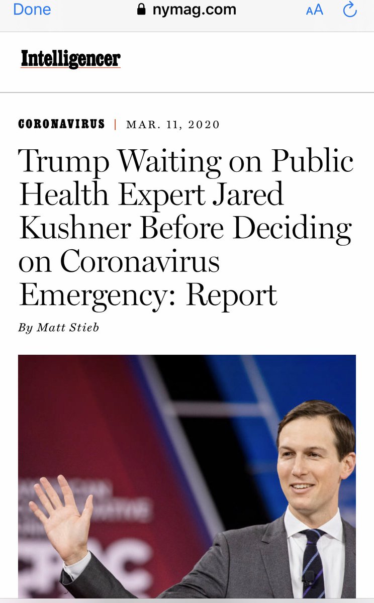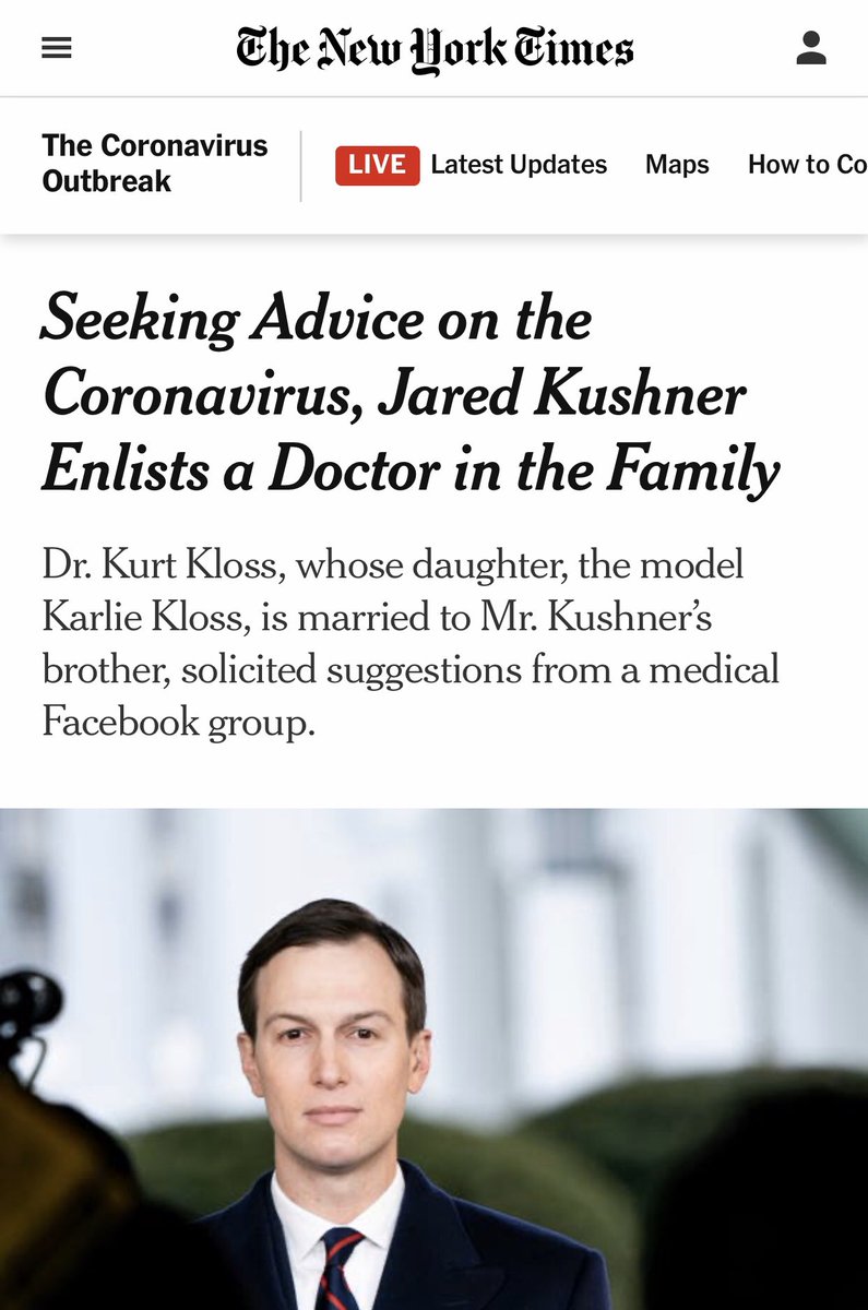方舟子@fangshimin·Mar 12川普最信赖的“公共卫生专家”是他的女婿库什纳,等库什纳对新冠病毒“研究”好了再做出决定。https://pbs.twimg.com/media/ES5AqliUUAIerE9?format=jpg&name=medium