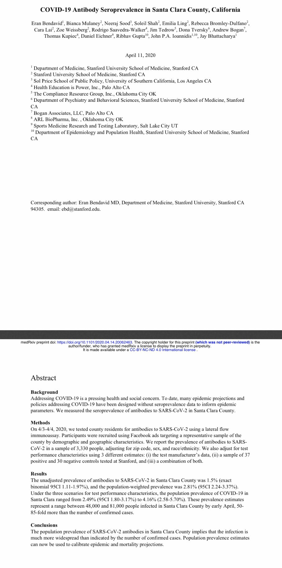 方舟子@fangshimin·Apr 17斯坦福大学在4月初抽查了硅谷一带(桑塔克拉克郡)3300居民的血液,推断那里居民到当时有2.49%-4.16%已被新冠病毒感染过产生了抗体,即该郡有48000-81000人已被感染,是确诊病例的50-85倍。到今天该郡共有69人死于新冠病毒感染,由此可算出新冠病毒感染死亡率大概是0.1%,与流感相当。https://pbs.twimg.com/media/EV1j5KiU8AE8_vC?format=jpg&name=large