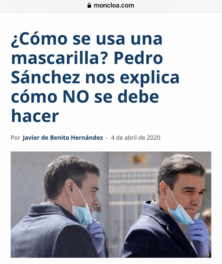 方舟子@fangshimin·Apr 18西班牙也有要不要建议全民戴口罩的争论。公共卫生官员反对全民戴口罩,政客们提倡全民戴口罩。西班牙首相以身作则戴着口罩参观工厂。看到他这么戴口罩,西班牙媒体惊呆了:这是在演示怎么地错误戴口罩?https://pbs.twimg.com/media/EV6yIGjVcAAnG4a?format=jpg&name=900x900