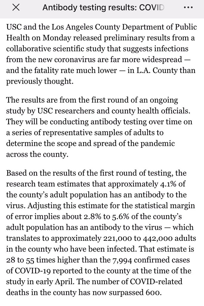 方舟子@fangshimin·Apr 21南加州大学研究人员抽查洛杉矶地区居民血液的初步结果出来了,4.1%试验对象的血液中含有针对新冠病毒的抗体,推断洛杉矶2.8%-5.6%的成年人已被新冠病毒感染,相当于22.1万-44.2万人,是四月初洛杉矶确诊病例的28-55倍,算得感染死亡率0.27%-0.54%。https://pbs.twimg.com/media/EWKct6MU0AApumc?format=jpg&name=medium