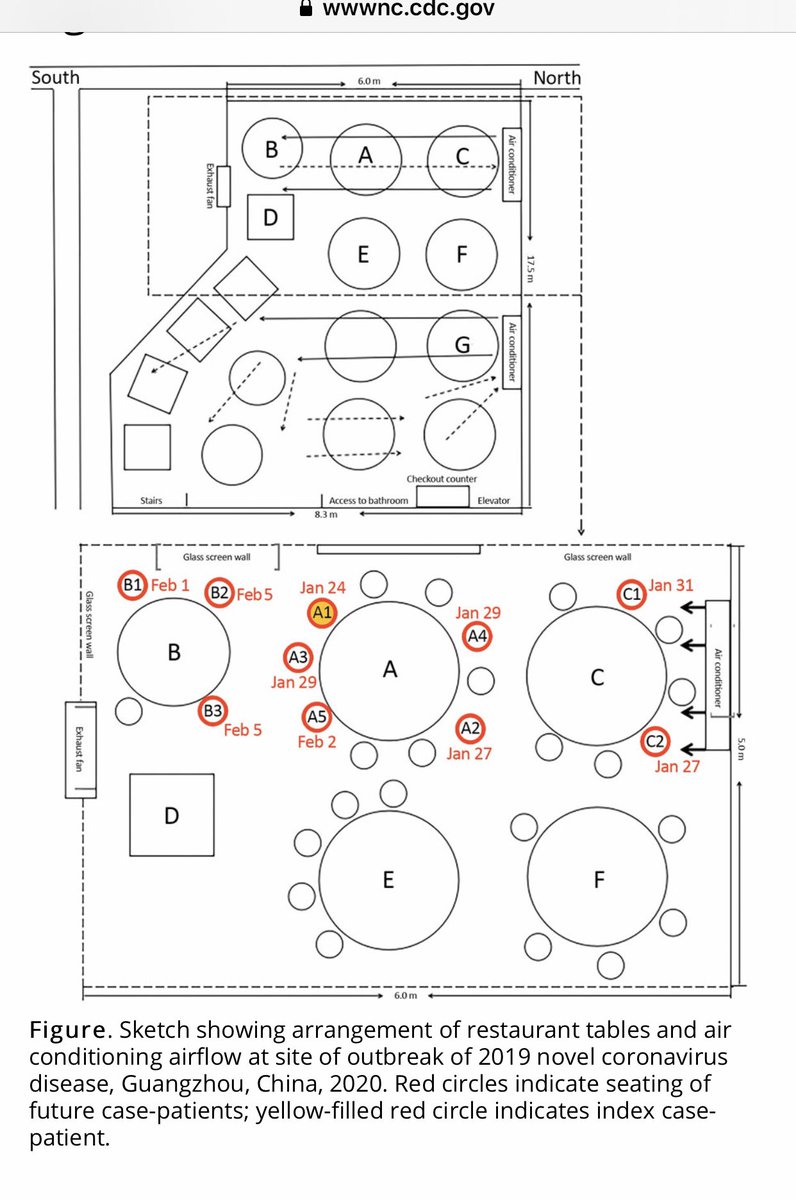 方舟子@fangshimin·Apr 21广东疾控中心对这起餐馆吃饭聚集性感染调查比较细。A1从武汉回来,1月24日发病当天与9人吃饭,4人被传染。前后两桌则共有5人被传染。餐馆其他顾客、工作人员都没被传染。这说明新冠病毒是通过飞沫传播的,不是通过气溶胶传播的。被传染者与传染者距离最远达3米,说明空调的气流会扩大飞沫传播范围。https://pbs.twimg.com/media/EWL9LLNUwAgA2gd?format=jpg&name=medium