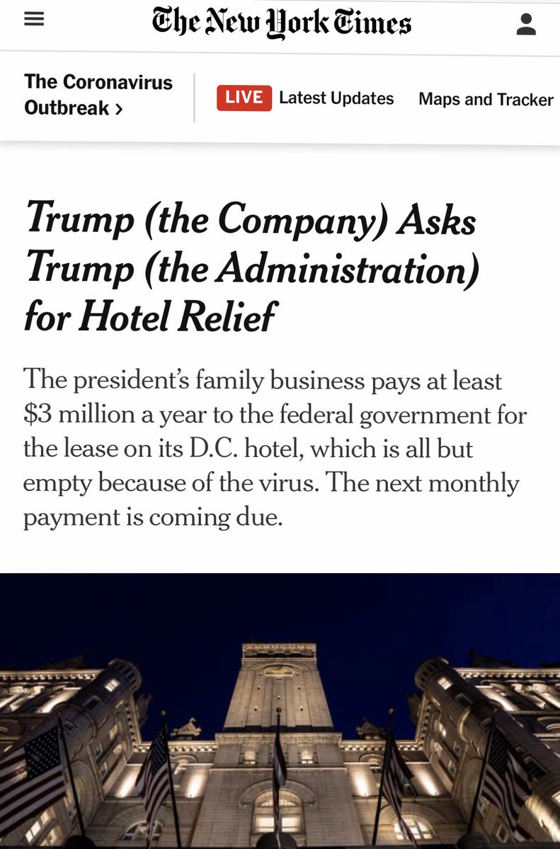 方舟子@fangshimin·Apr 23川普公司向川普当局要求救济:川普公司在华盛顿的川普宾馆是向联邦政府租用的,现在因为疫情没人去住了,川普公司要求川普当局取消租金。https://pbs.twimg.com/media/EWRjN4zVAAAU1SA?format=jpg&name=medium