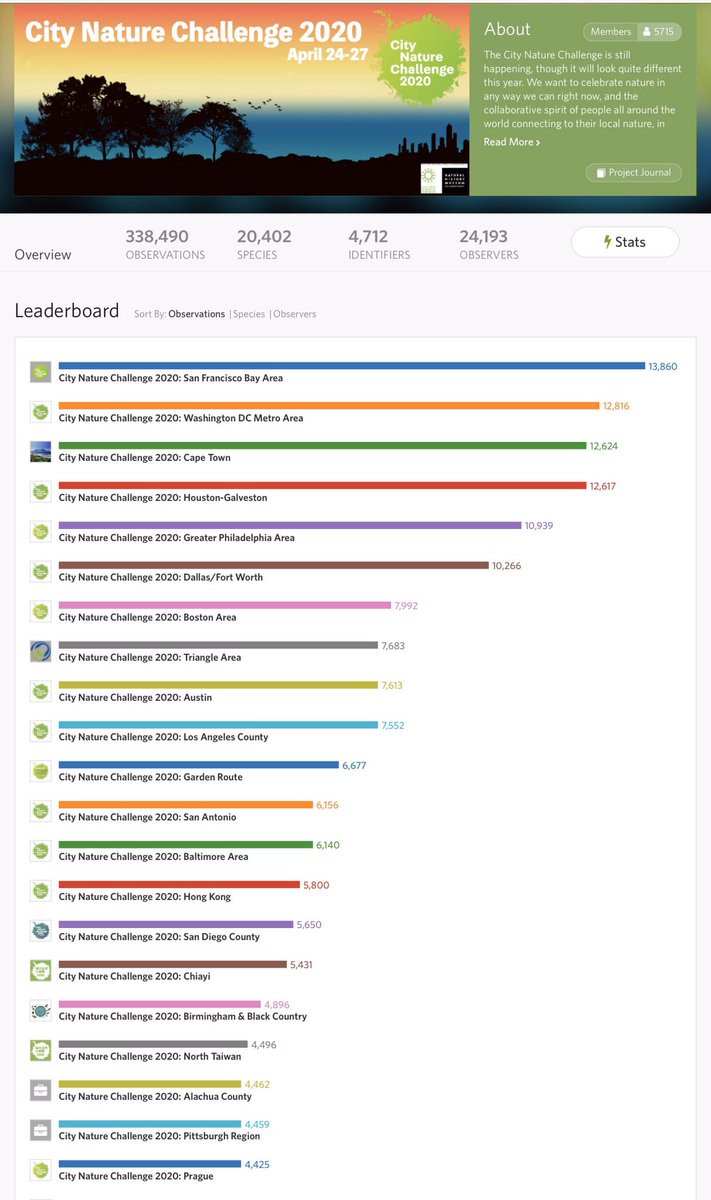 方舟子@fangshimin·Apr 26今年的“城市自然挑战赛”说是受新冠病毒疫情的影响,不比赛改合作了。但实际上还是有排名榜。这只是第一天的结果,到下周一结束。全世界有200个城市参加,中国大陆依然是空白。https://pbs.twimg.com/media/EWg0QD9UwAAtmqP?format=jpg&name=medium