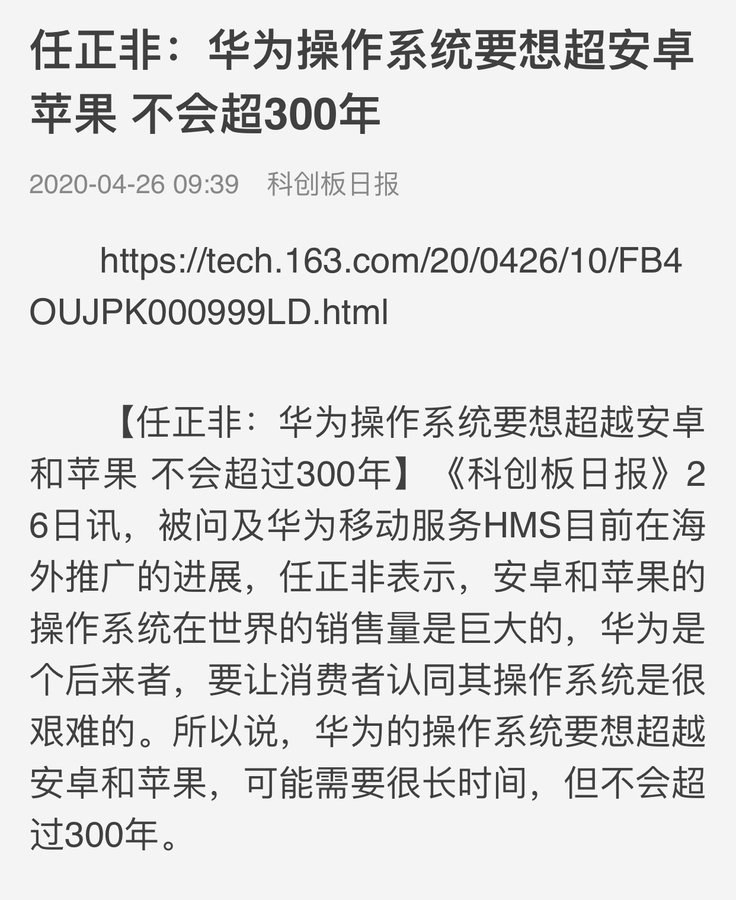 方舟子@fangshimin·Apr 26任正非眼光真够深远,思考的是未来300年内的大事。他以为一个手机操作系统能用300年?https://pbs.twimg.com/media/EWhBVinVAAAtiRc?format=jpg&name=900x900