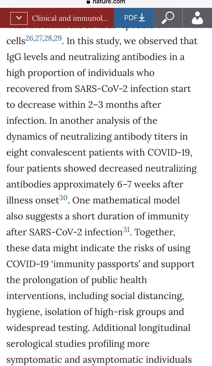 方舟子@fangshimin·Jun 18被新冠病毒感染2-3个月后,抗体就已下降,相当一部分感染者(无症状感染者的40%,有症状感染者的13%)检测不到抗体了。当然这并非意味着对新冠病毒没有了免疫力(免疫力主要靠记忆细胞),只是说明抗体普查的假阴性可能比预料的高。https://pbs.twimg.com/media/Ea2PrKdVcAETD7-?format=jpg&name=medium