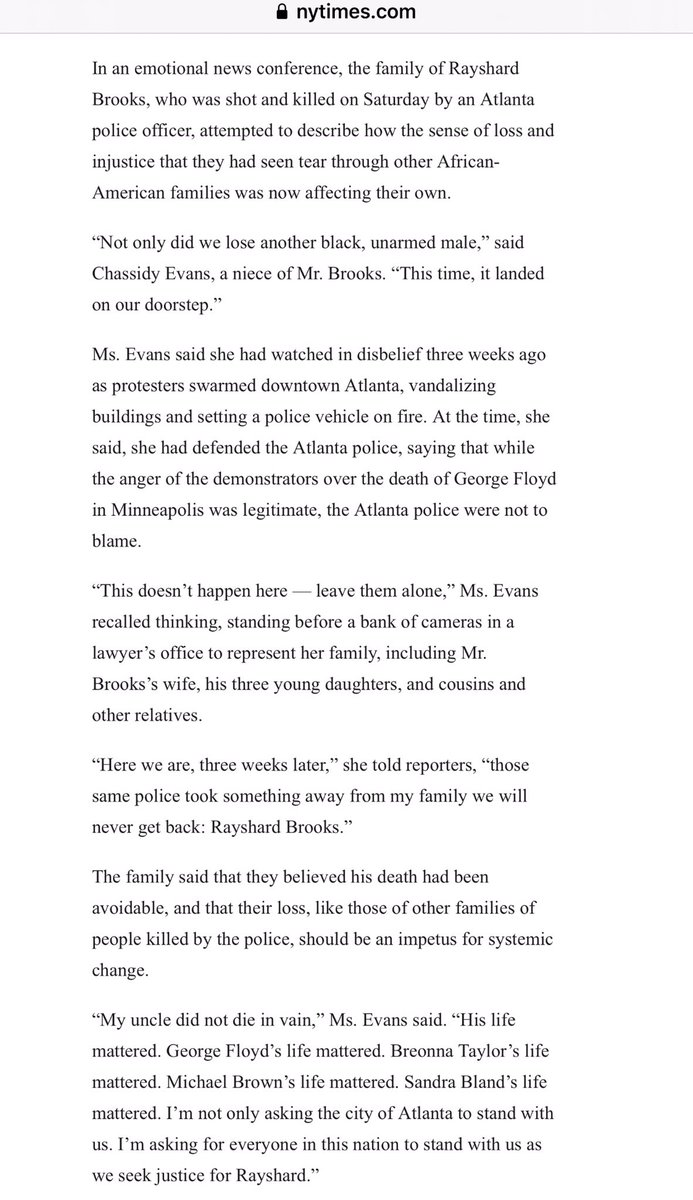 方舟子@fangshimin·Jun 15亚特兰大被杀黑人布鲁克斯的外甥女说,她本来对发生在亚特兰大对抗议是很不以为然的,认为佛洛依德被杀是明尼阿波利斯的事,与亚特兰大警察局无关。现在才知道覆巢之下焉有完卵。https://pbs.twimg.com/media/EamnsdUU4AADAqc?format=jpg&name=medium